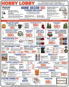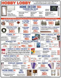 Hobby Lobby is the leader in arts, crafts, and home decor items with over 70,000 products. There are over 600 stores nationwide. Their ads are released in the Sunday newspaper circular every week. Their ad is almost always one page in length and features a 40% off coupon.