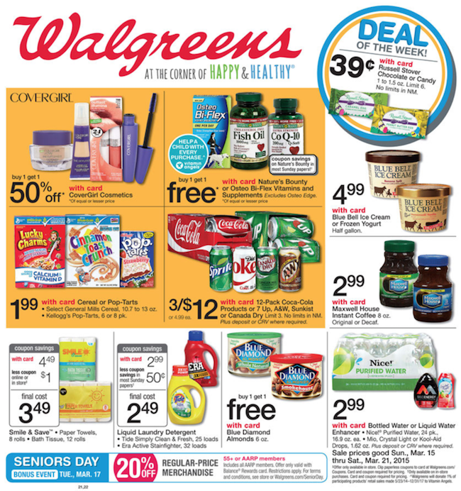 Walgreens ad for March 15 – 21, 2015.  This week’s ad features BOGO 50% off CoverGirl Cosmetics, BOGO Nature’s Bounty or Osteo Bi-Flex Vitamins and Supplements; Cereal or Pop-Tarts $1.99 each; Blue Bell Ice Cream $4.99/half gallon; Maxwell House Instant Coffee 8oz $2.99 each.  All deals require a Walgreens club card to receive the discount.
